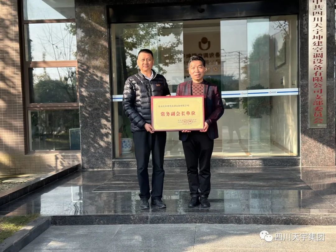 最后,大邑縣沙渠企業(yè)家協(xié)會秘書長王蘭剛為四川天宇坤建空調(diào)設(shè)備有限公司頒授“2023年度常務(wù)副會長單位”牌匾,天宇集團常務(wù)副總經(jīng)理程德君參與授牌儀式。