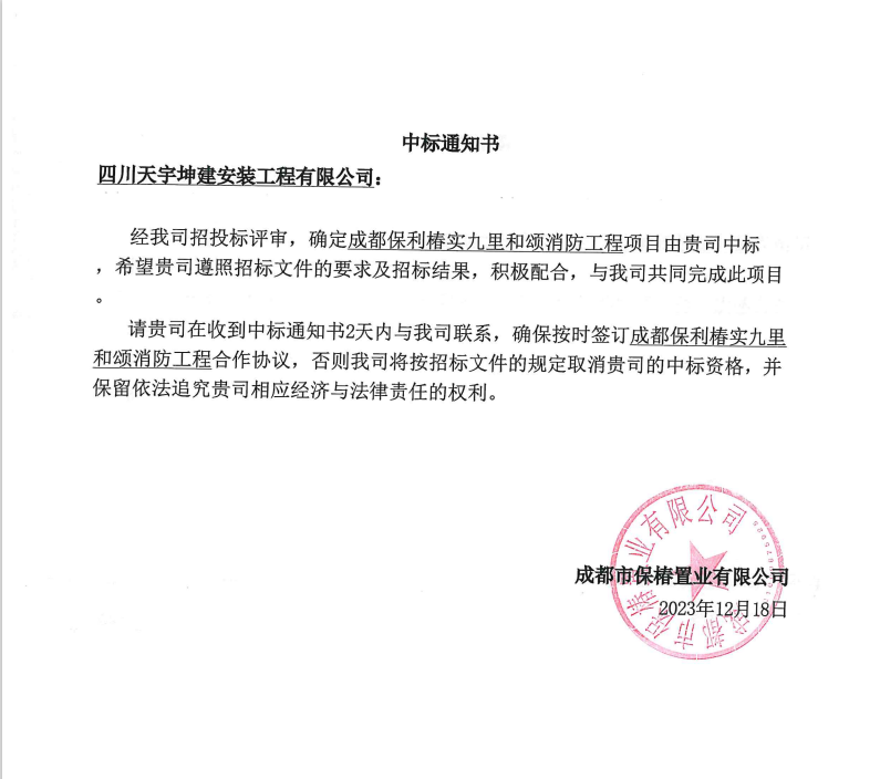 熱烈慶祝我司“四川天宇坤建安裝工程有限公司”中標(biāo)《成都保利椿實(shí)九里和頌》消防工程項(xiàng)目